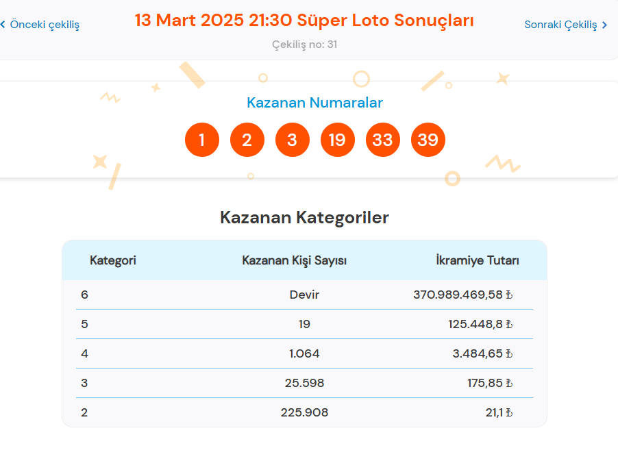 Süper Loto’nun 13 Mart 2025 saat 21.30’da gerçekleştirilen çekilişinde, 6 bilen çıkmadı ve tam 370.989.469,58 TL ikramiye devretti.