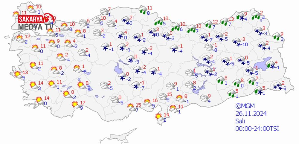 Meteoroloji Genel Müdürlüğü tarafından yapılan son varsayımlara nazaran, ülke genelinin modüllü ve çok bulutlu, Marmara’nın doğusu, Doğu Akdeniz, İç Anadolu’nun doğusu, Karadeniz, Doğu Anadolu (Van hariç) ile Güneydoğu Anadolu’nun aralıklı yağışlı geçeceği kestirim ediliyor. Genellikle karla karışık yağmur ve kar, Orta ve Doğu Karadeniz kıyıları, Güneydoğu Anadolu ile Yalova, Sinop, Iğdır ve Şırnak etraflarında yağmur ve sağanak, Doğu Akdeniz kıyıları ile Güneydoğu Anadolu’nun güneyinde yer yer gök gürültülü sağanak yağış biçiminde olması beklenen yağışların, Doğu Akdeniz’in doğusu, Karadeniz kıyıları, Doğu Anadolu’nun batısı ve Güneydoğu Anadolu ile Sakarya, Bolu, Niğde, Kayseri, Sivas, Karaman, Tokat, Gümüşhane, Bayburt, Erzurum, Muş, Bitlis ve Hakkari etraflarında yer yer kuvvetli olacağı kestirim ediliyor. HAVA SICAKLIĞI: Hava sıcaklıklarının İç ve Güney Ege, Akdeniz, İç Anadolu, Orta ve Doğu Karadeniz, Doğu Anadolu’nun ve Güneydoğu Anadolu’nun batısında 5 ila 15 derecede azalarak mevsim normalleri altında seyredeceği varsayım ediliyor. KUVVETLİ YAĞIŞ UYARISI: Yağışların; Doğu Akdeniz’in doğusu, Karadeniz kıyıları, Doğu Anadolu’nun batısı ve Güneydoğu Anadolu ile Sakarya, Bolu, Niğde, Kayseri, Sivas, Karaman, Tokat, Gümüşhane, Bayburt, Erzurum, Muş, Bitlis ve Hakkari etraflarında yer yer kuvvetli olması beklendiğinden, yaşanabilecek aksiliklere karşı dikkatli ve önlemli olunması isteniyor.
