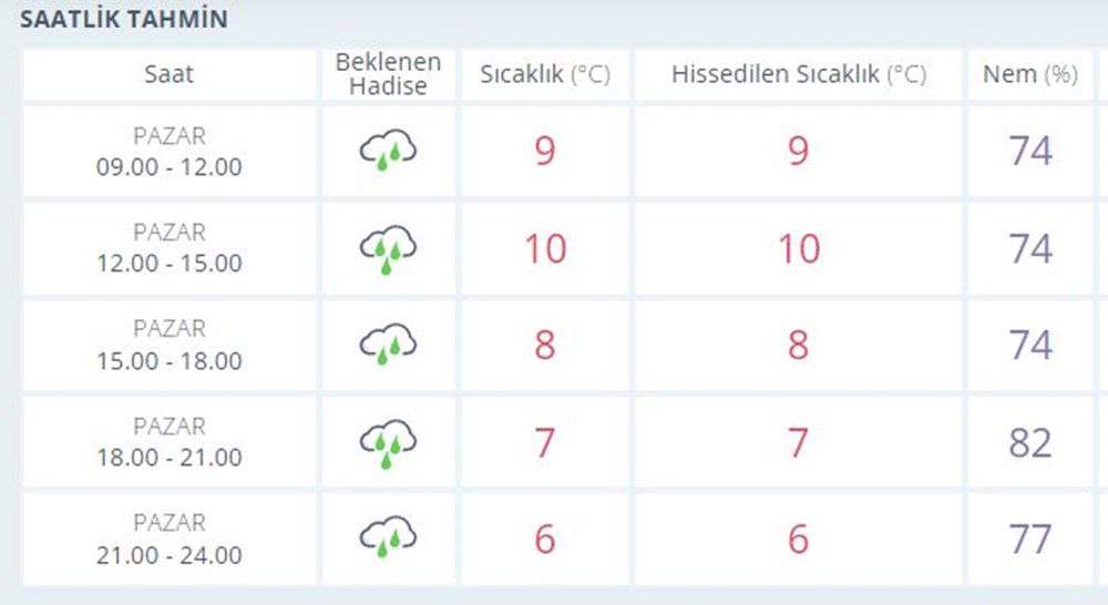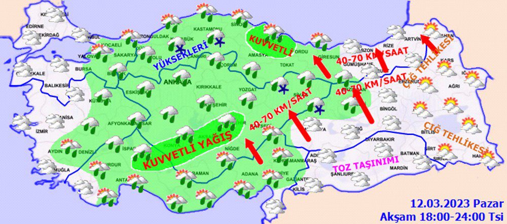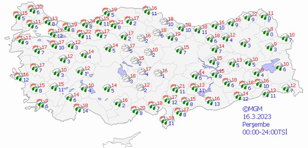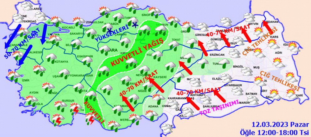 Meteoroloji Genel Müdürlüğü tarafından yapılan son değerlendirmelere göre: Ülke genelinin parçalı ve çok bulutlu, Marmara, Ege, Akdeniz, İç Anadolu, Batı ve Orta Karadeniz, Giresun, Erzincan ve Tunceli ile Malatya’nın kuzey ve batı çevrelerinin yağmur ve sağanak, yer yer gök gürültülü sağanak yağışlı geçeceği tahmin ediliyor. Yağışların, Batı Akdeniz, İç Anadolu’nun kuzeybatısı, Orta Karadeniz ile Muğla, Denizli, Uşak, Afyonkarahisar, Konya, Aksaray, Nevşehir ve Sinop çevrelerinin kuvvetli, Antalya’nın kuzey ve doğusunda çok kuvvetli olması bekleniyor. Doğu Karadeniz’in iç kesimleri ile Doğu Anadolu’nun eğimli ve yüksek kesimlerinde çığ tehlikesi riski bulunmaktadır. Hava sıcaklıklarda önemli bir değişiklik olmayacağı, genellikle mevsim normalleri civarında, yurdun kuzey ve doğu kesimlerinde normallerinin 8-10 derece üzerinde seyretmeye devam edeceği tahmin ediliyor.