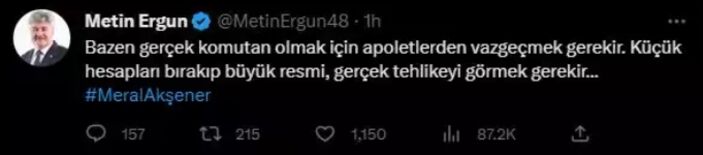 İYİ Parti Kurucular Kurulu Üyesi Metun Ergun ise şu yorumu yaptı:“Bazen gerçek komutan olmak için apoletlerden vazgeçmek gerekir. Küçük hesapları bırakıp büyük resmi, gerçek tehlikeyi görmek gerekir.”İBB Meclisi İYİ Parti Grup Başkanvekili İbrahim Özkan sosyal medya hesabından, “Millet ne derse o olacak” dedi.