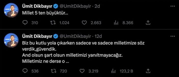 İyi Parti Sakarya Milletvekili Ümit Dikbayır sosyal medyadan yaptığı “Millet 5’ten büyüktür” yorumunu kısa bir süre sonra sildi. Dikbayır, yaptığı diğer açıklamasında ise şu ifadeleri kullandı: