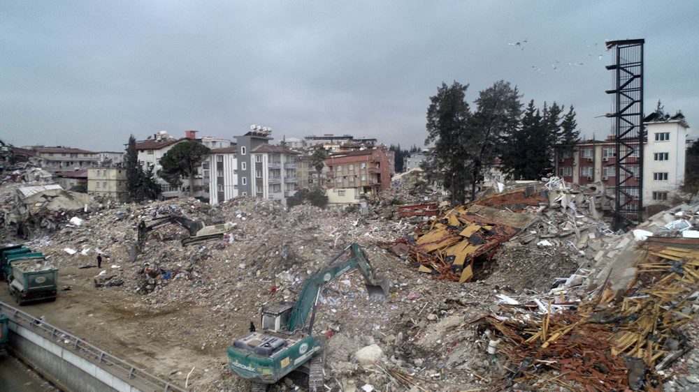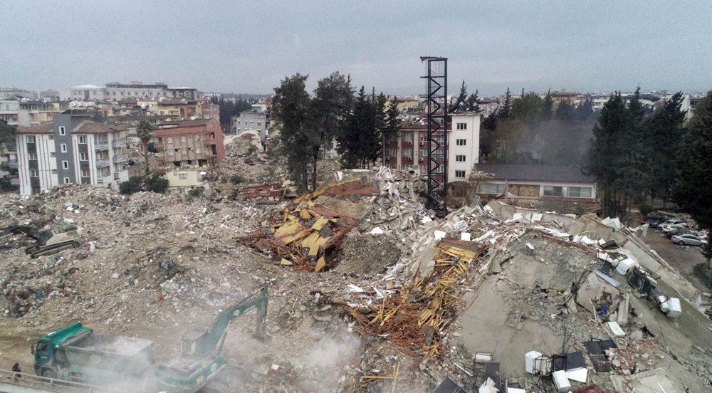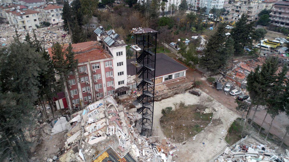 Kahramanmaraş merkezli 7,7 ve 7,4’lük depremlerde büyük yıkımın yaşandığı Hatay’da, dün akşam saatlerinde 3 dakika arayla 6,4 ve 5,8 büyüklüğünde 2 deprem meydana geldi. İlk depremlerde büyük hasar gören Antakya ilçesi Ürgen Paşa Mahallesi Atatürk Caddesi’ndeki Mustafa Kemal Üniversitesi Mimarlık Fakültesi’ne bağlı 7 katlı misafirhane, dünkü depremlerde tamamen çökerken, sadece yangın merdiveninin ayakta kaldığı görüldü.