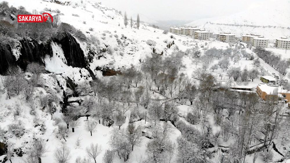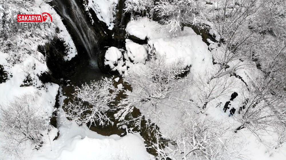 Kısmen donması nedeniyle buz sarkıtlarının da oluştuğu şelalenin beyaz örtüyle bütünleşmesiyle kartpostallık görünümler oluştu.