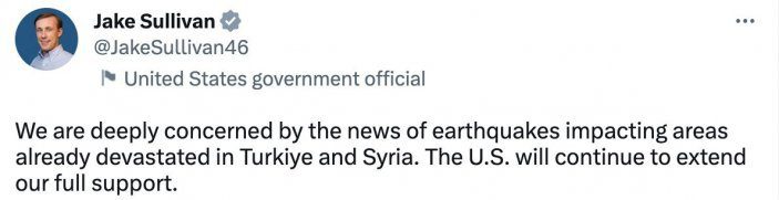 ABD Ulusal Güvenlik Danışmanı Jake Sullivan, Türkiye ve Suriye’yi etkileyen, Hatay’ın Defne ilçesi merkezli 6,4 büyüklüğündeki depremin ardından sosyal medya hesabından destek mesajı yayınladı.