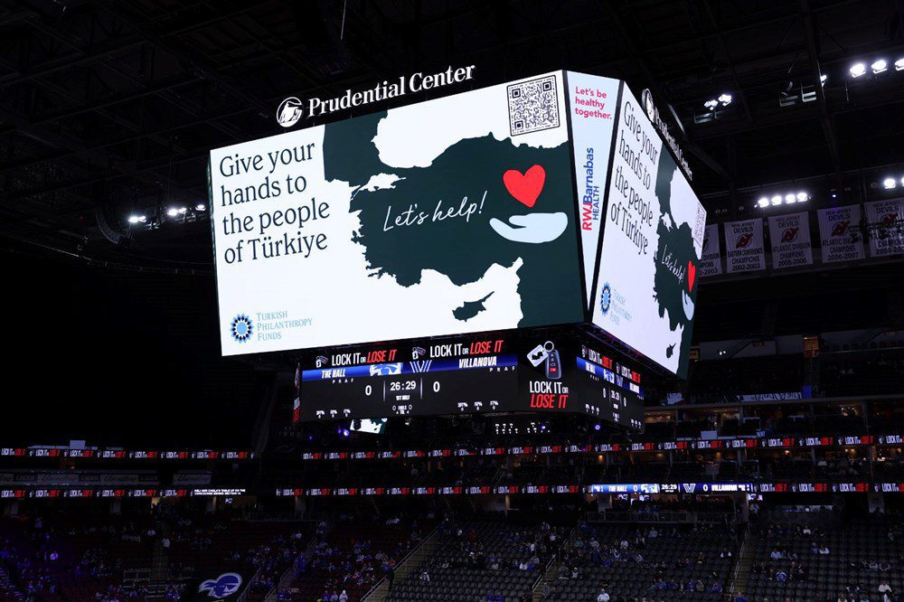 Merkezi ABD’de bulunan sivil toplum kuruluşu Turkish Philanthropy Funds (TPF) girişimiyle gerçekleşen kampanya çerçevesinde, Newark’ta Prudential Center’daki NCAA maçının oynanacağı salonda, Türkiye’deki deprem görüntülerinden oluşan video gösterildi. Basket sahasının üzerindeki dev ekranlarda binlerce basketseverin izlediği görüntülerle birlikte, salonda yapılan anonsla Türkiye’deki depremzedeler için yardım çağrısında bulunuldu.