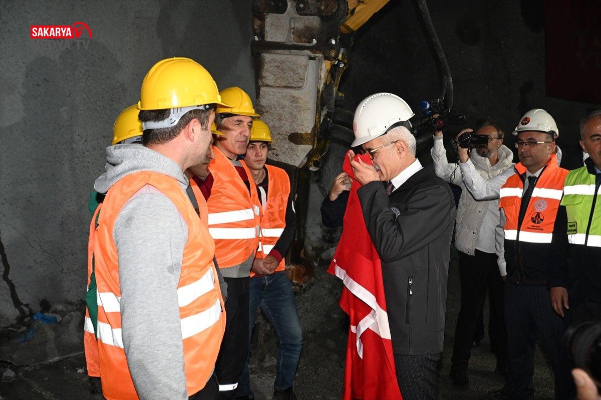 Açılan kısmından ellerinde Türk bayrağıyla tünele giren çalışanları karşılayan Uraloğlu, bayrağı teslim aldı. Kaynak: Anadolu Ajansı (AA)
