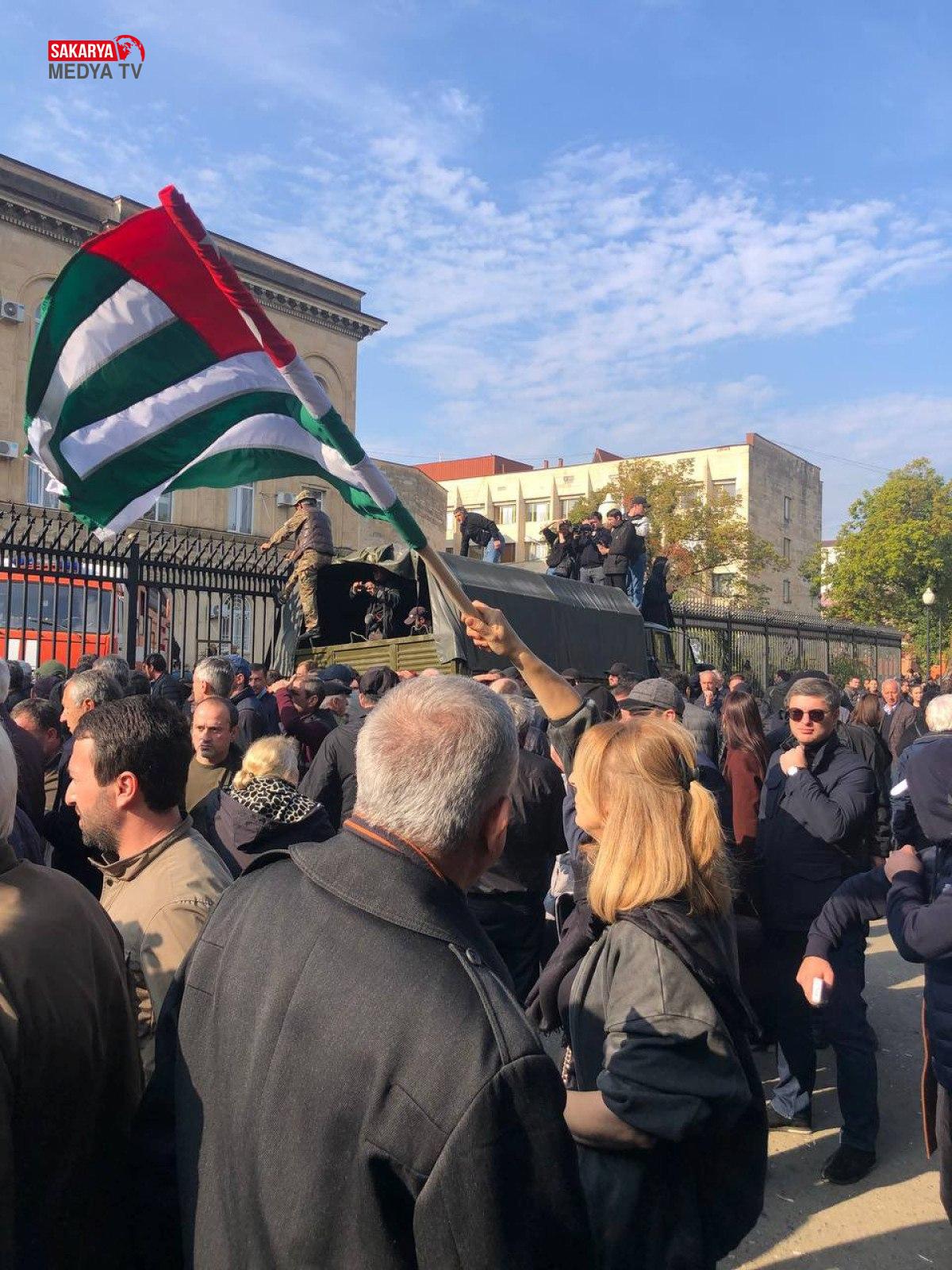 Muhalefet önderliğindeki çok sayıda protestocu, anlaşmanın milletvekillerinin onayına sunulacağı Abhazya parlamentosu önünde toplandı.