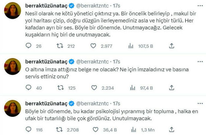 Resmi Twitter hesabından art arda paylaşımlar yapan Berrak Tüzünataç şu ifadeleri kullandı:Nesil olarak ne kötü yönetici çıktınız ya. Bir öncelik belirleyip, makul bir yol haritası çizip, doğru düzgün ilerleyemediniz asla ve hiçbir türlü.