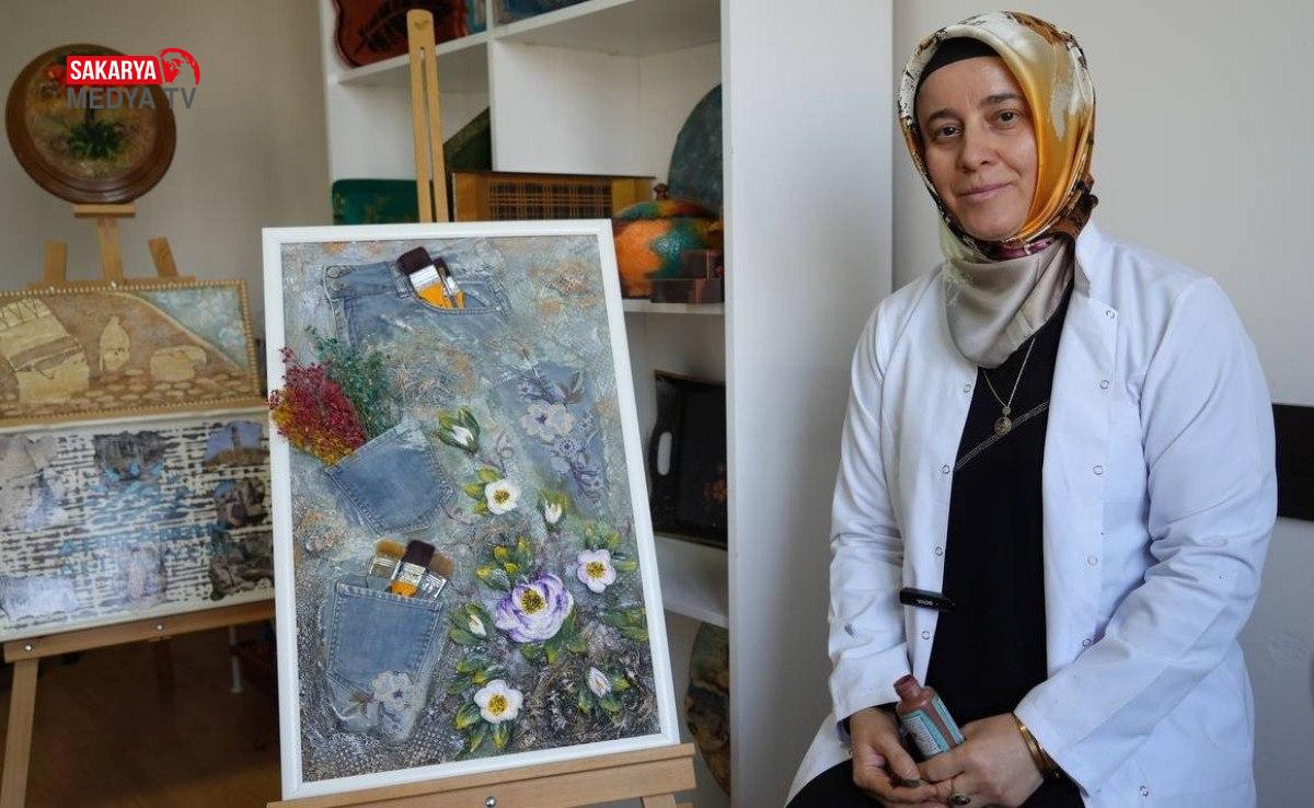 Usta öğretici Perihan Pamukçu, proje kapsamında zelzelede kız kardeşinin konutundan çıkarılan bir kot pantolondan tablo yaptı.