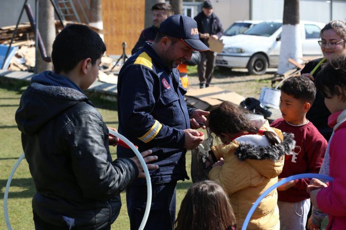 Arama kurtarma çalışmalarından çadır kurulumuna kadar her alanda çalışan AFAD görevlileri, depremde en büyük travmayı yaşayan çocuklara hediyeler dağıttı.