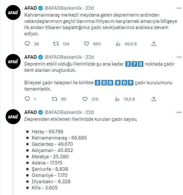 Yapılan son açıklamada ise deprem bölgelerinde kurulan çadır sayısına yer verildi. Paylaşımda şu ifadeler yer aldı:Kahramanmaraş merkezli meydana gelen depremlerin ardından vatandaşlarımızın geçici barınma ihtiyacını karşılamak amacıyla bölgeye ilk andan itibaren başlattığımız çadır sevkiyatlarımız aralıksız devam ediyor.