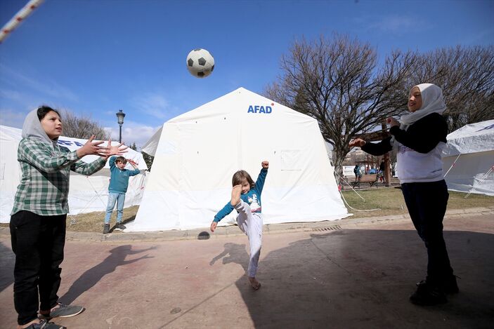 Çadır kentlerin dron görüntülerinin bulunduğu videoda, buralardaki çocukların, destek ekipleriyle oyun oynadıkları anlar da yer aldı.