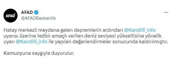 Hatay merkezli meydana gelen depremlerin ardından Kandilli Rasathanesi’nin uyarısı üzerine tedbir amaçlı verilen deniz seviyesi yükseltisine yönelik uyarı, Kandilli Rasathanesi ile yapılan değerlendirmeler sonucunda kaldırılmıştır.