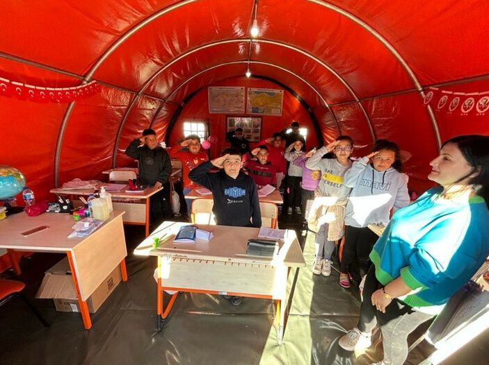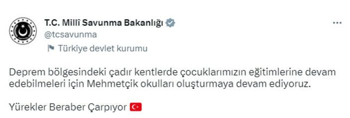Paylaşımda şu ifadelere yer verildi:Deprem bölgesindeki çadır kentlerde çocuklarımızın eğitimlerine devam edebilmeleri için Mehmetçik okulları oluşturmaya devam ediyoruz.