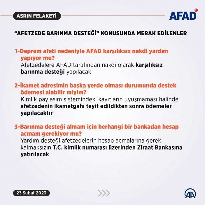 Yardım desteği afetzedelerin hesap açmalarına gerek kalmaksızın T.C. kimlik numarası üzerinden Ziraat Bankası’na yatırılacaktır.