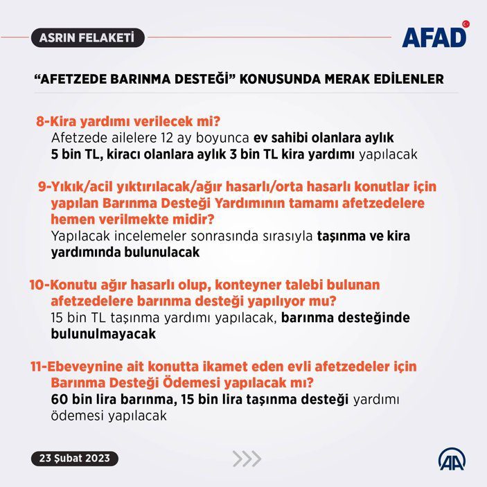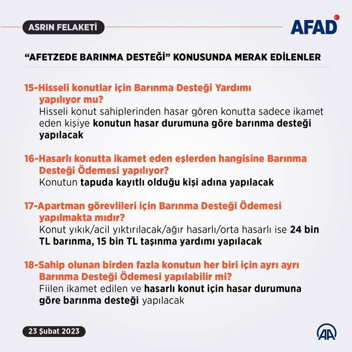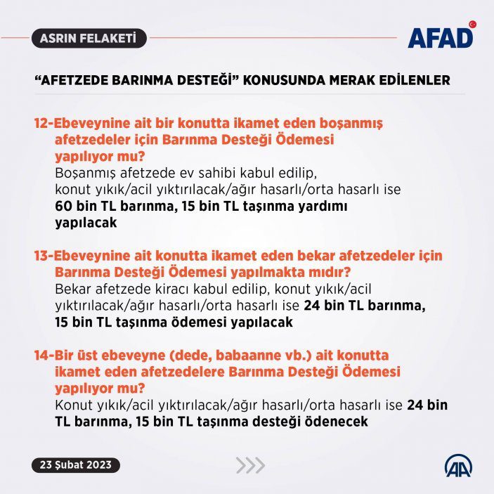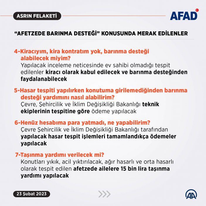 Çevre Şehircilik ve İklim Değişikliği Bakanlığı tarafından hasarlı olarak tespit edilen ev sahibi veya kiracı vatandaşlar için, “Afetzede Barınma Desteği” başvuruları e-Devlet üzerinden yapılıyor. Afetzedelere taşınma, geçici barınma ve temel ihtiyaçlarını gidermek üzere afetler sonrasında AFAD tarafından nakdi olarak karşılıksız barınma desteği yapılıyor. Konutları yıkık, ağır hasarlı ve orta hasarlı olarak tespit edilen konut sahipleri ve kiracılar, Afetzede Barınma Desteği’nden yararlanabiliyor. Afetzede ailelere 15 bin TL, ev sahibi olanlara 5 bin ve kiracılara ise 3 bin TL yardım yapılıyor.