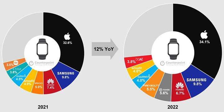 2022 yılı sonunda küresel akıllı saat sevkiyatları 2021 yılına kıyasla %12 artış gösterdi. Araştırma şirketi Counterpoint Research‘ün raporuna göre bu artışta geçen yılın ilk üç çeyreğindeki güçlü satışlar etkili olurken, analistler artan enflasyon nedeniyle son çeyrekte sevkiyatlarda yıllık bazda %2’lik bir düşüş kaydetti. Apple, hacim olarak toplam sevkiyatlarda %34,1’lik bir payla akıllı saatlerde küresel pazar lideri olmaya devam ediyor. Parasal anlamda ise Apple, sektörün gelirlerinin %60’ını oluşturuyor. Analistler Apple’ın artan payını 2022 sonbaharında piyasaya sürülen Apple Watch Series 8, Apple Watch Ultra ve Apple Watch SE’ye yönelik güçlü talebe bağlıyorlar.