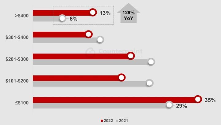 Bir önceki yıla göre %129‘luk artışla 400 dolar ve üzeri fiyat aralığındaki akıllı saatler en büyük sevkiyat artışını gösterdi. Büyümenin büyük kısmının ise Apple Watch Series 8 ve Watch Ultra‘nın piyasaya sürülmesinden kaynaklandığı bildirildi.