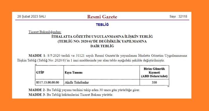 Ticaret Bakanlığı tarafından alınan yeni karar ile birlikte kapsamında akıllı telefon ithalatında uygulanan gözetim uygulamasının limiti artırıldı. Bu uygulama uygun fiyatlı telefonları doğrudan ilgilendirirken karar Resmi Gazete’de de yayınlandı. Resmi Gazete’nin 28 Şubat tarihli sayısında “İthalatta Gözetim Uygulanmasına İlişkin Tebliğ’de Değişiklik Yapılmasına Dair Tebliğ” düzenlemesi gerçekleştirildi. Alınan karar kapsamında akıllı telefon ithalatı için gözetim uygulaması limiti adet başına 200 dolar seviyesinden 350 dolar seviyesine yükseltildi. Değişiklik 28 Mart’tan itibaren uygulamaya girecek.