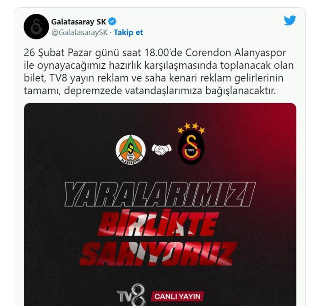 Maçın ayrıntılarını paylaşan Sarı – Kırmızılı takım; “26 Şubat Pazar günü saat 18.00’de Corendon Alanyaspor ile oynayacağımız hazırlık karşılaşmasında toplanacak olan bilet, TV8 yayın reklam ve saha kenari reklam gelirlerinin tamamı, depremzede vatandaşlarımıza bağışlanacaktır.” ifadelerini kullandı.