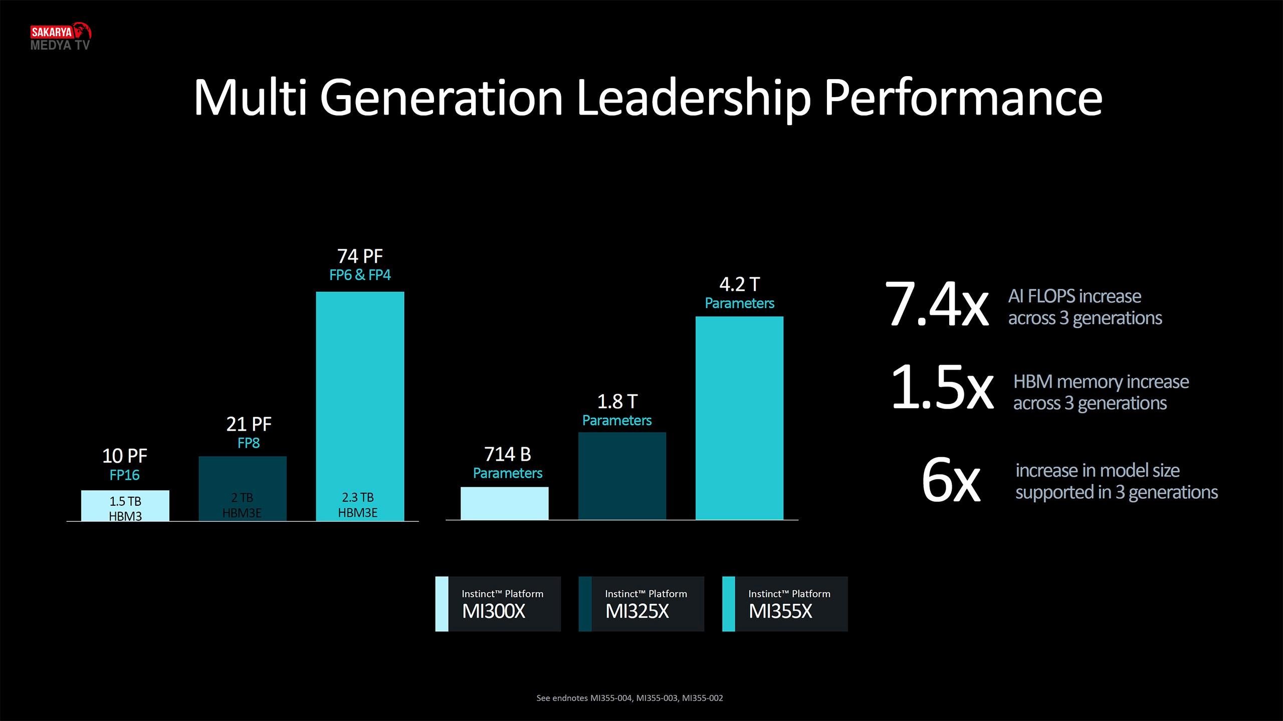 MI300X’in 1.3 petaflop FP16 ve 2.61 petaflop FP8 hesaplama gücüne sahip olduğu biliniyor. MI355X ise bu sayıları sırasıyla 2.3 ve 4.6 petaflop seviyelerine çıkararak yüzde 77’lik bir performans artışı sunuyor.