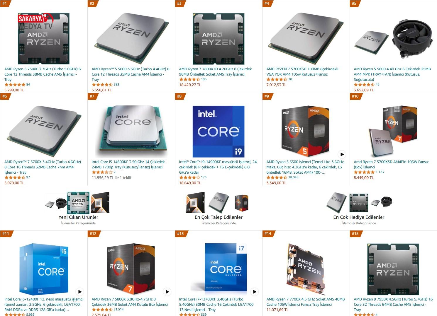 Amazon Türkiye’nin en çok satan listesinde de durum benzer; Intel, Core i9-14900KF ile 8. sırada yer alıyor ve geri kalan AMD modellerinden oluşuyor. Elbette Amazon’un bu listelerinin dönemsel olduğunu ve günden güne değişebileceğini de belirtmek gerek.