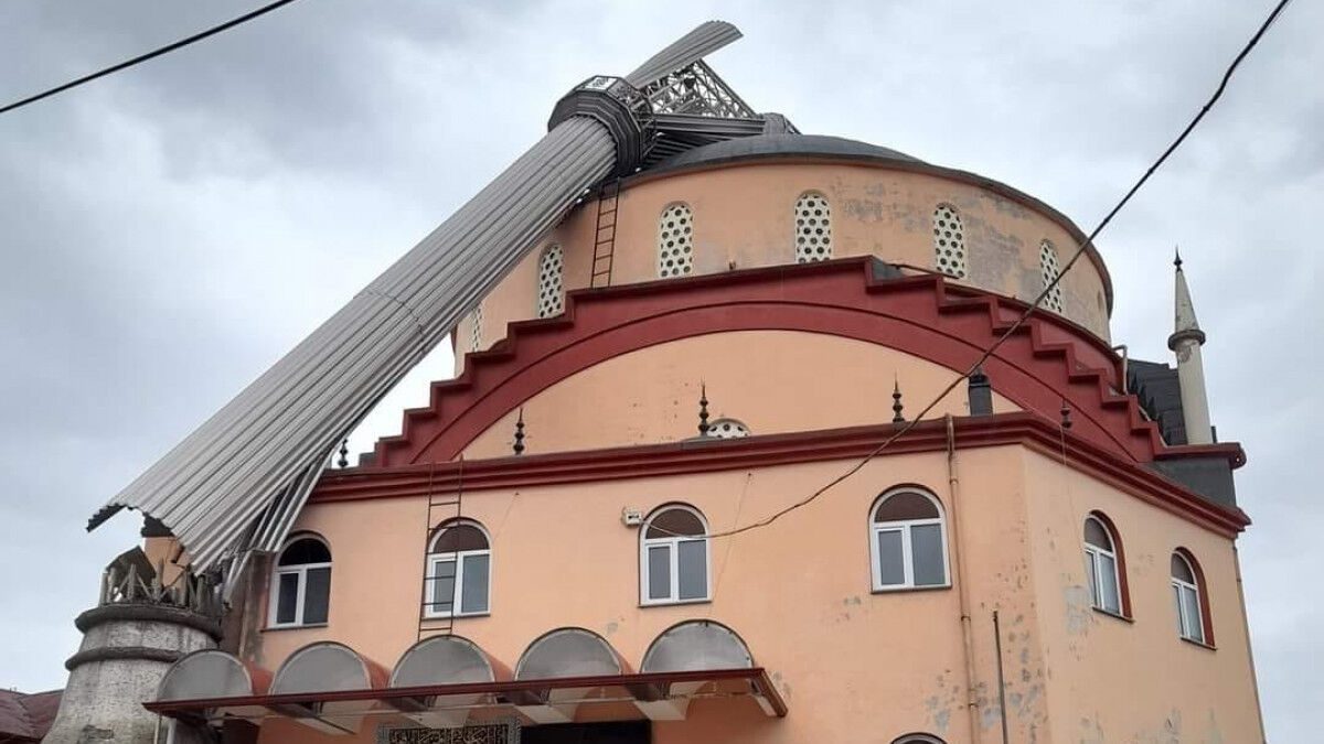 Zonguldak’ta şiddetli rüzgardan caminin minaresi devrildi