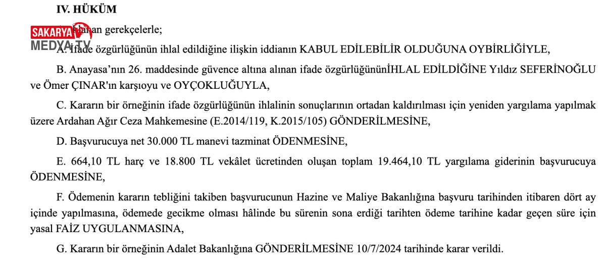 AYM, tespit edilen ihlalin sonucun ortadan kaldırılması için yine yargılama yapılmasına karar vererek, belgeyi Ardahan Ağır Ceza Mahkemesi’ne gönderdi.