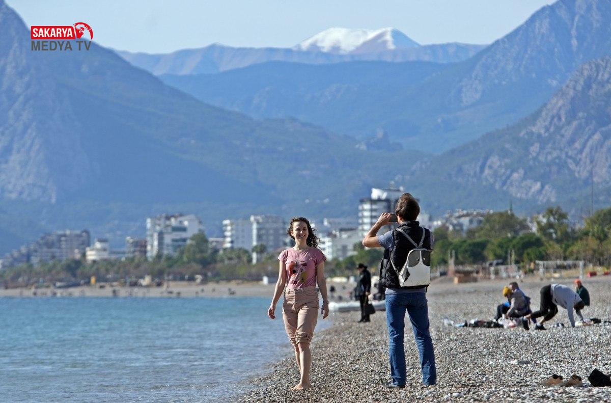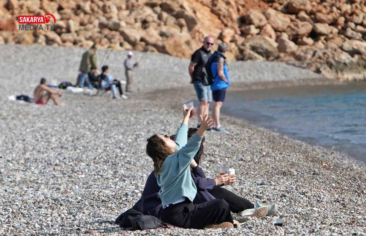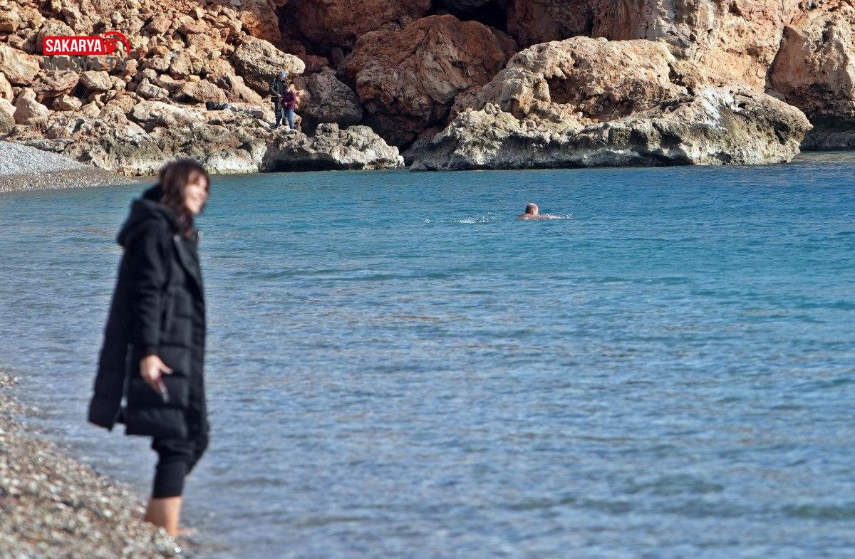 Tatilciler ve kent sakinleri kışlık montlarını giydi, bazıları ise Konyaaltı Sahili’ne inip 22 derece ölçülen deniz suyu sıcaklığında denize girdi, kimileri de ayaklarını denize soktu.
