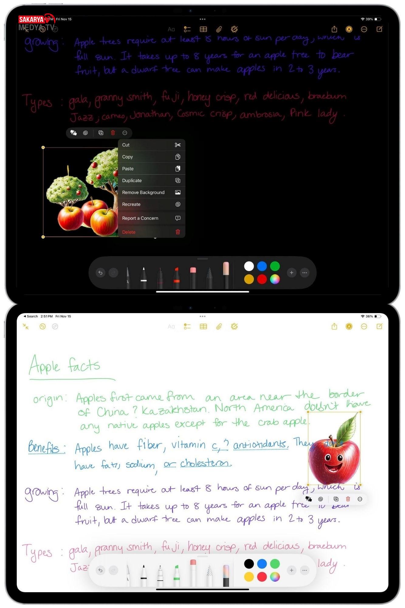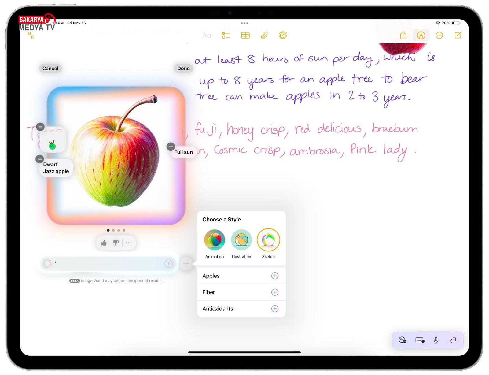 iOS 18.2 ile 9 Aralık’ta kullanıcılarla buluşacak olan Image Wand, geleneksel görsel üretim araçlarından farklı olarak, kullanıcıların el çizimlerini temel alarak görsel üretebilme özelliğiyle öne çıkıyor. Image Playground ve Genmoji’nin aksine, kullanıcı eskizlerini referans alabilen bu özellik, özellikle eğitim ve yaratıcı not alma süreçlerinde benzersiz bir deneyim sunuyor. Notlar uygulamasında aktif olan bu teknoloji, gelecekte Freeform gibi diğer Apple uygulamalarında da kullanıma sunulabilir. Özelliğin en dikkat çekici yanlarından biri, not içeriğini analiz ederek nota uygun görseller üretebilmesi. iPad kullanıcıları Apple Pencil ile yazdıkları notlardan, iPhone kullanıcıları ise dokunmatik ekran üzerinden girdikleri metinlerden ilham alarak görsel oluşturabiliyor. İşaretleme menüsündeki renkli uçlu sihirbaz değneği simgesiyle erişilen bu özellik, kullanıcılara birden fazla görsel alternatifi sunuyor. Image Wand, Eskiz, İllüstrasyon ve Animasyon olmak üzere üç farklı stil seçeneğini kullanıcılara sunuyor.
