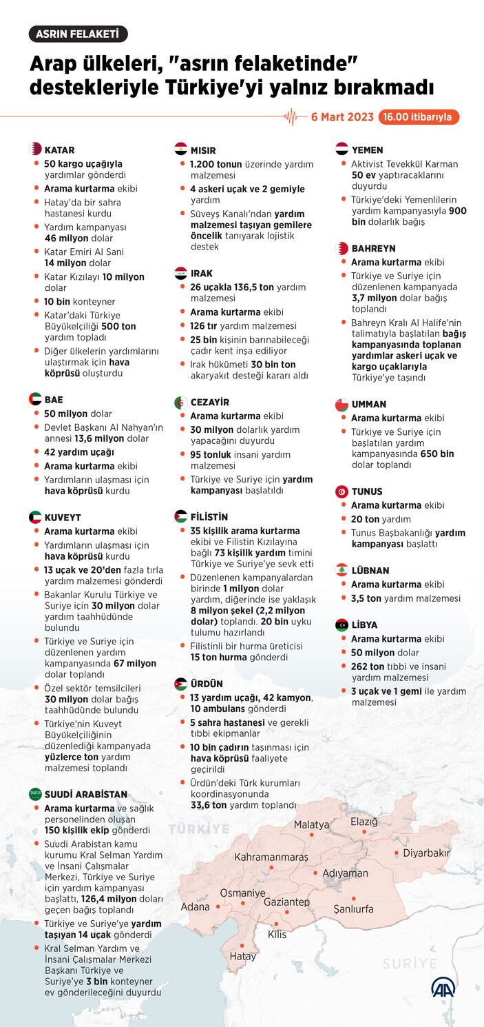 Birçok Arap ülkesi, Kahramanmaraş merkezli depremlerin ardından Türkiye’nin yaraları sarmak için her türlü yardımda bulundu. İlk günden itibaren arama kurtarma ekiplerini gönderen bölge ülkeleri, depremzedeler için her türlü yardım için çeşitli kampanyalar düzenledi.