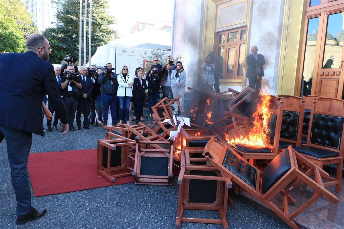 Genel konsey salonundaki arbede ve gerginliğin akabinde, muhalefetteki milletvekilleri, oturdukları sandalyelerden kimilerini meclis binası dışarısına çıkararak ateşe verdi.