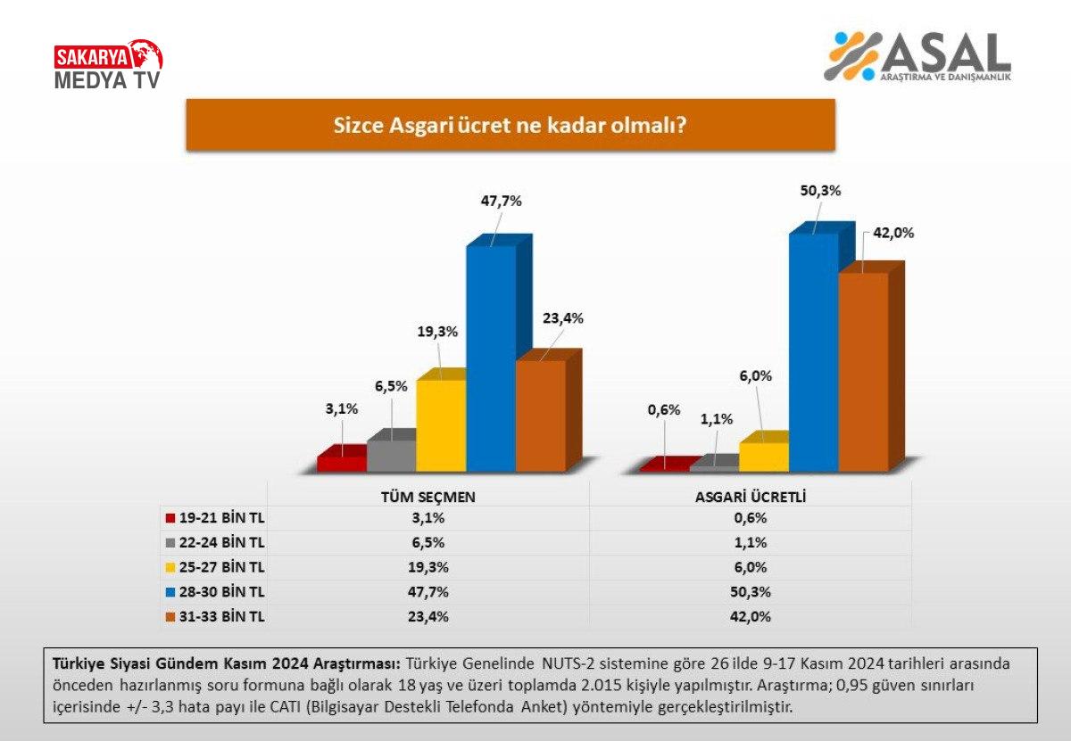 26 ilde 9-17 Kasım tarihleri arasında 2 bin 15 kişi ile gerçekleştirilen ankette, “Sizce asgari ücret ne kadar olmalı?” diye soruldu.