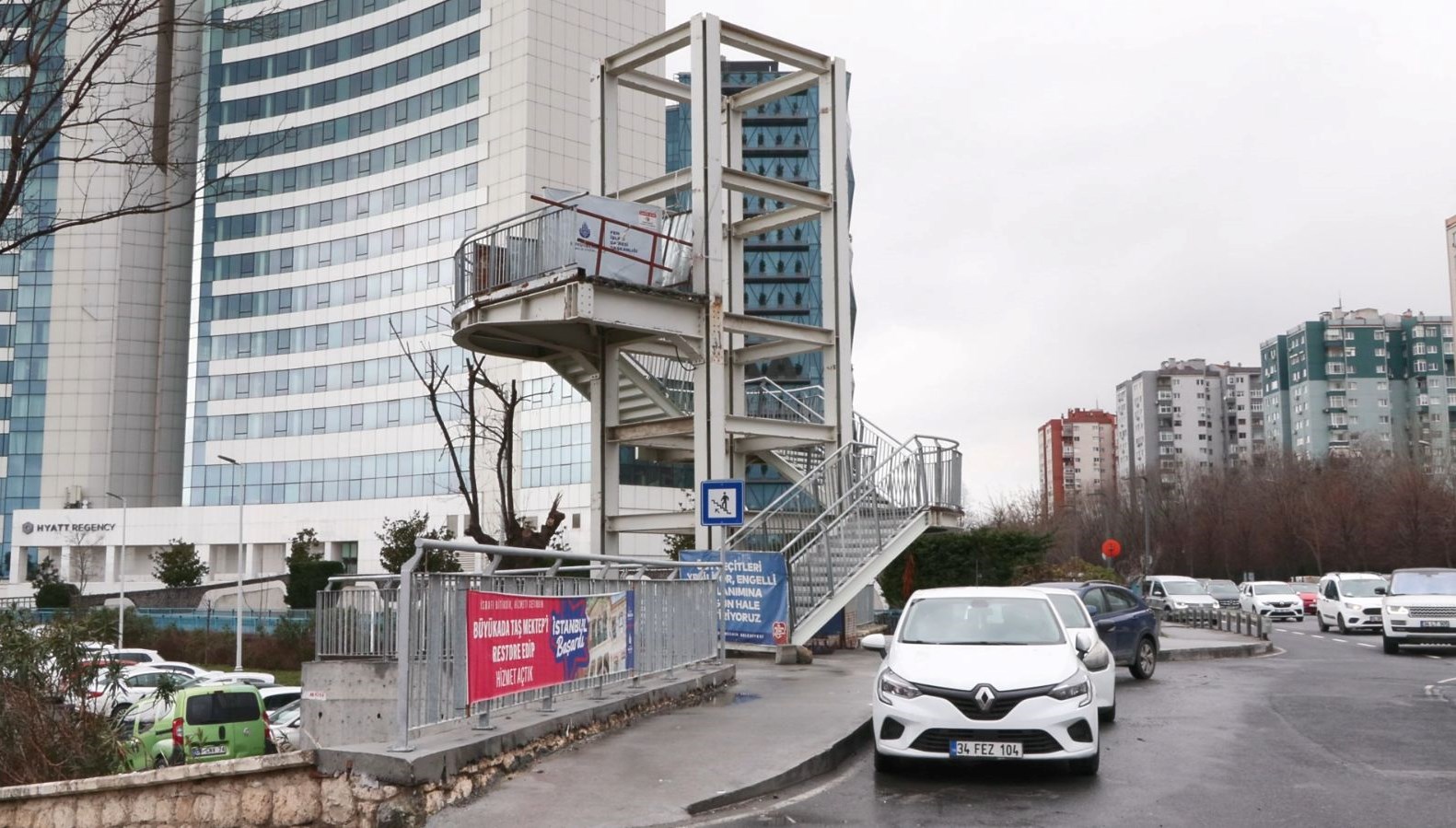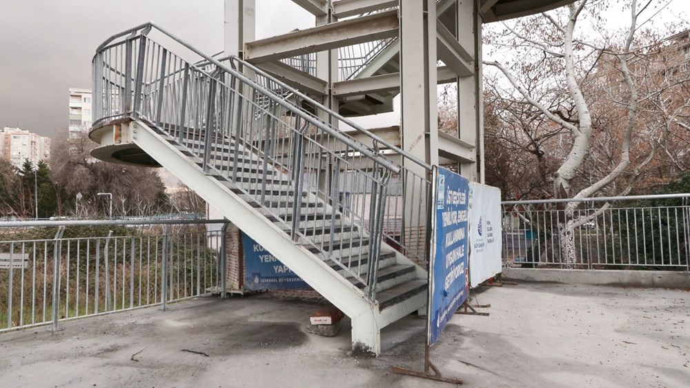 Üst geçide İBB tarafından “Üst geçitleri yeniliyoruz, engellilerin kullanımı için uygun hale geçiriyoruz” yazısı konuldu.
