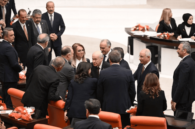 MHP Genel Başkanı Devlet Bahçeli, Meclis’te düzenlenen yeni yasama yılı resepsiyonunda gazetecilerin sorularını yanıtlamış, Özel ve Bakırhan ile tokalaşmasının sorulmasına karşılık Bahçeli, “Yeni bir periyoda giriyoruz. Dünyada barış isterken kendi ülkemizde barışı sağlamak lazım” karşılığını vermişti.
