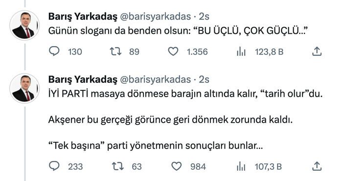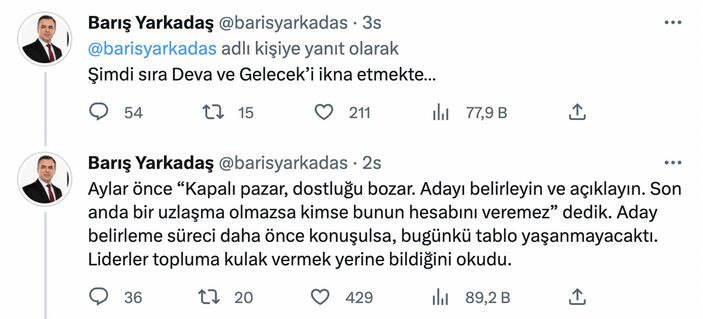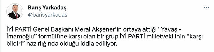 Yarkadaş, Meral Akşener’in Yavaş-İmamoğlu formülüne karşı olan bir grup İyi Partili vekilin, karşı bildiri hazırladığını iddia etti. Bir diğer yandan Akşener’in masaya dönmezde barajın altında kalarak tarih olacağı nedeniyle döndüğü vurgulandı.