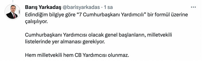 Ayrıca, Cumhurbaşkanı Yardımcısı olacak genel başkanların, milletvekili listelerinde yer almaması gerekiyor. İşte Barış Yarkadaş’ın o paylaşımları;