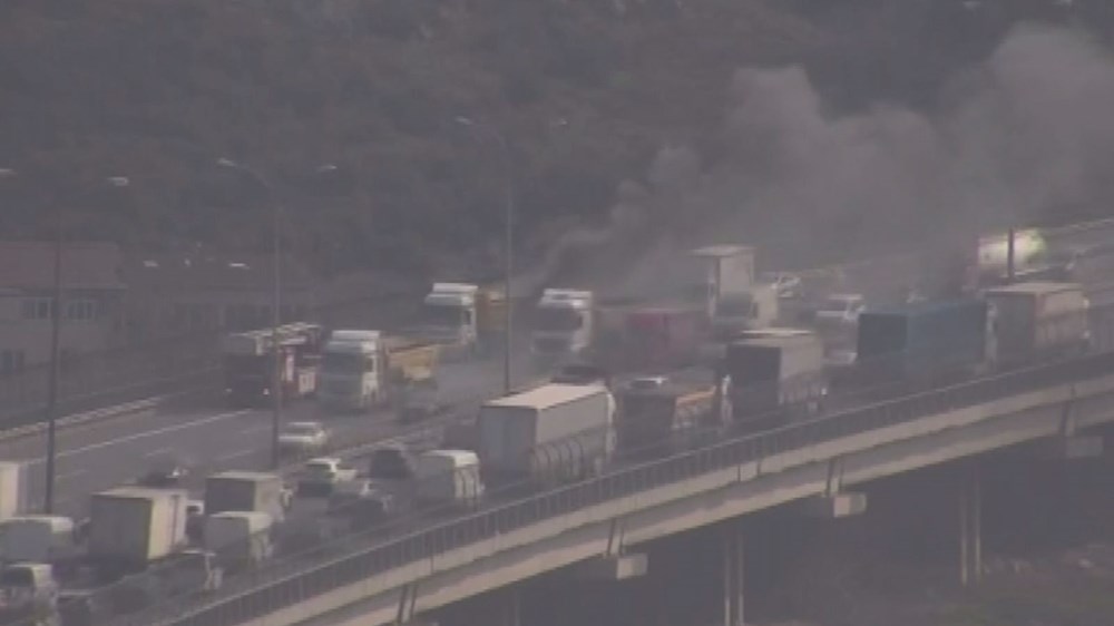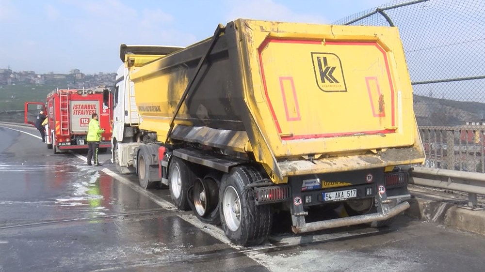 TEM Otoyolu Yarımburgaz Viyadüğü Edirne istikametinde seyir halindeki bir hafriyat kamyonunda saat 11.00 sıralarında yangın çıktı. Hafriyat kamyonunun sürücüsü dorse lastiklerinden duman çıktığını gördü ve aracı emniyet şeridinde durdurdu. Şoför, yangın tüpü ile aracın lastiklerini söndürmeye çalışsa da başarılı olamadı.