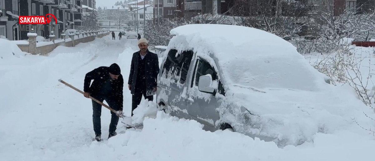Belediye ekiplerinin yol temizleme çalışmaları devam ederken, vatandaşlar da kendi imkanlarıyla araçlarını kar yığınlarından çıkarmaya çalıştı.