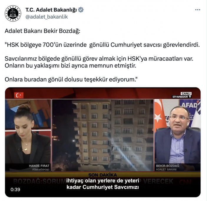 Adalet Bakanı Bekir Bozdağ, Hande Fırat’ın sunuculuğunu yaptığı Gece Görüşü programına canlı bağlantıyla bağlanarak 700 üzerinde savcının görevlendirildiğini duyurdu.