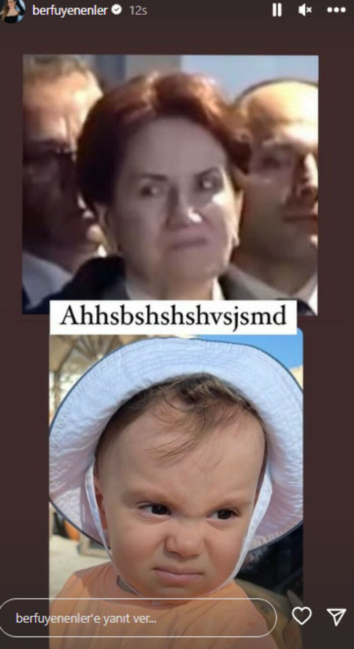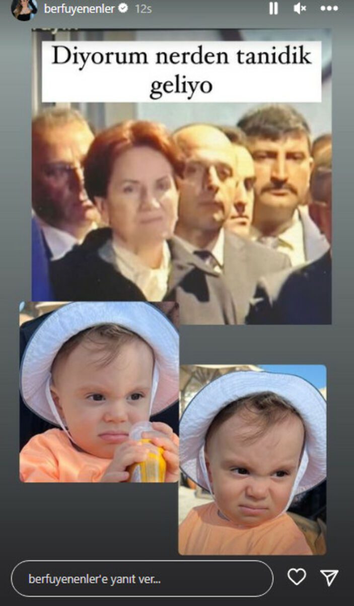 Berfu Yenenler Akşener’in mimiklerini ti’ye aldı. “Diyorum nereden tanıdık geliyor” notuyla paylaşım yapan Yenenler, Akşener’in fotoğrafının yanına küçük oğlunun suratını ekledi.