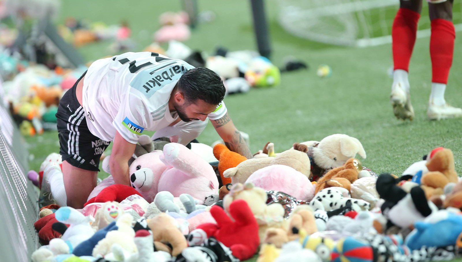 Beşiktaş taraftarı, depremden etkilenen çocuklar için yüzlerce oyuncağı ve içi doldurulmuş oyuncakları sahaya fırlattı.