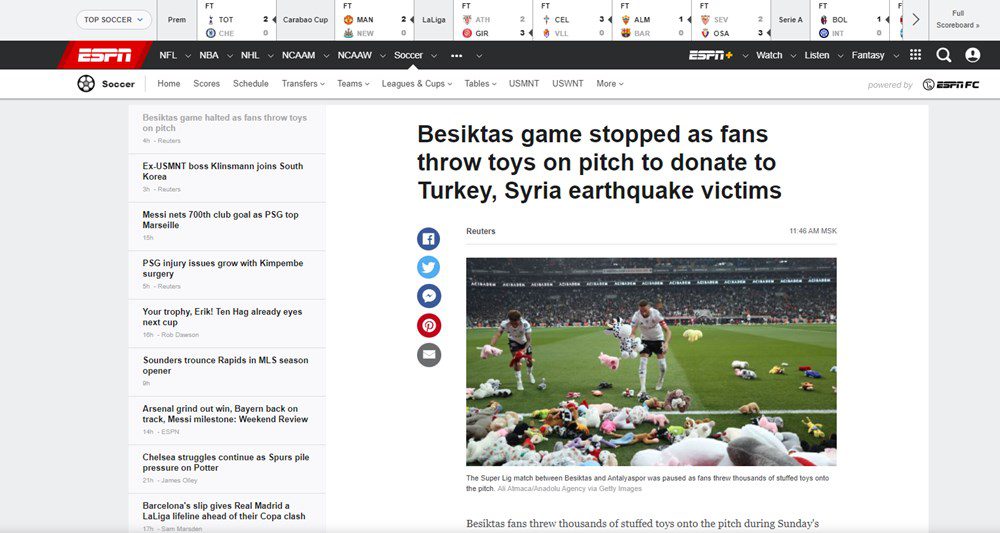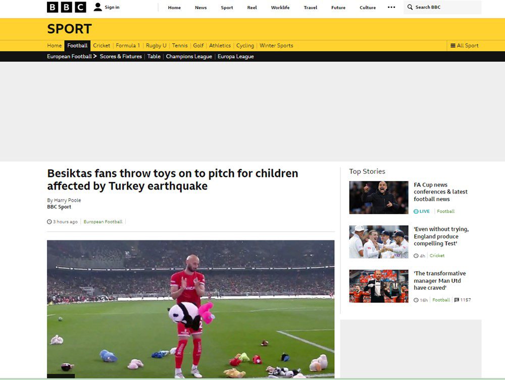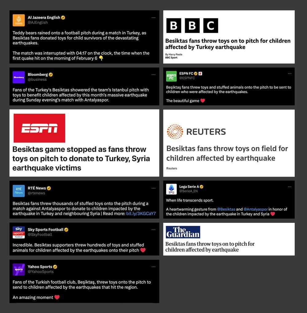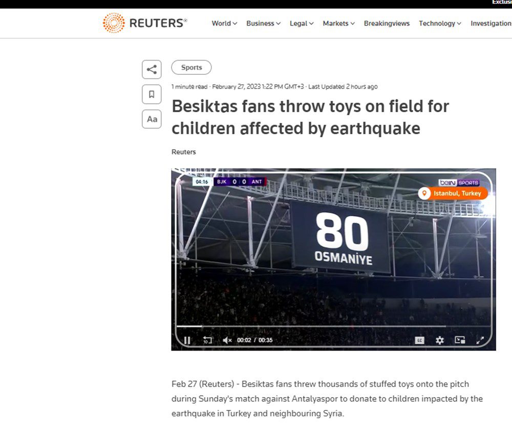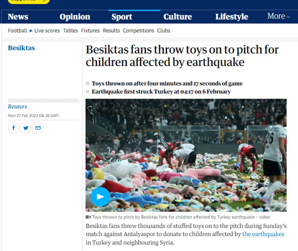 The Guardian: İstanbul’da Beşiktaş ile Antalyaspor arasında oynanan maçta, Türkiye’deki depremden sağ kurtulan çocuklara bağış olarak binlerce oyuncak ayı ve pelüş oyuncaklar sahaya atıldı. Reuters: Beşiktaş taraftarları depremden etkilenen çocuklar için sahaya oyuncak fırlattı. BBC: Taraftarlar deprem bölgesindeki çocuklara hediye edilmek üzere atkı, bere ve pelüş oyuncaklar attı.