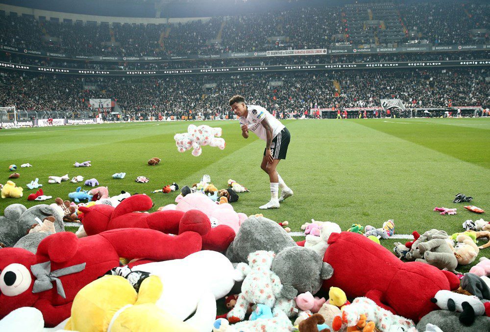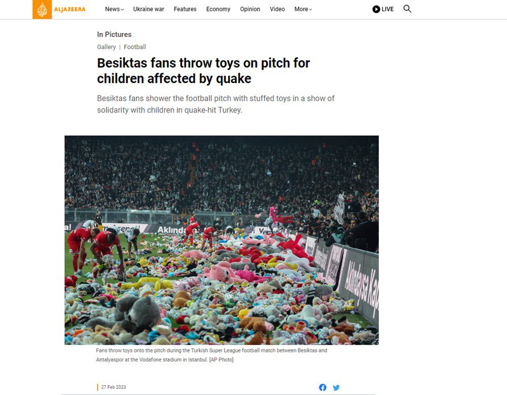 Güzel oyun… Al Jazeera English: Beşiktaş taraftarları depremden kurtulan çocuklara oyuncak bağışlarken, maç sırasında futbol sahasına oyuncak ayılar yağdı.