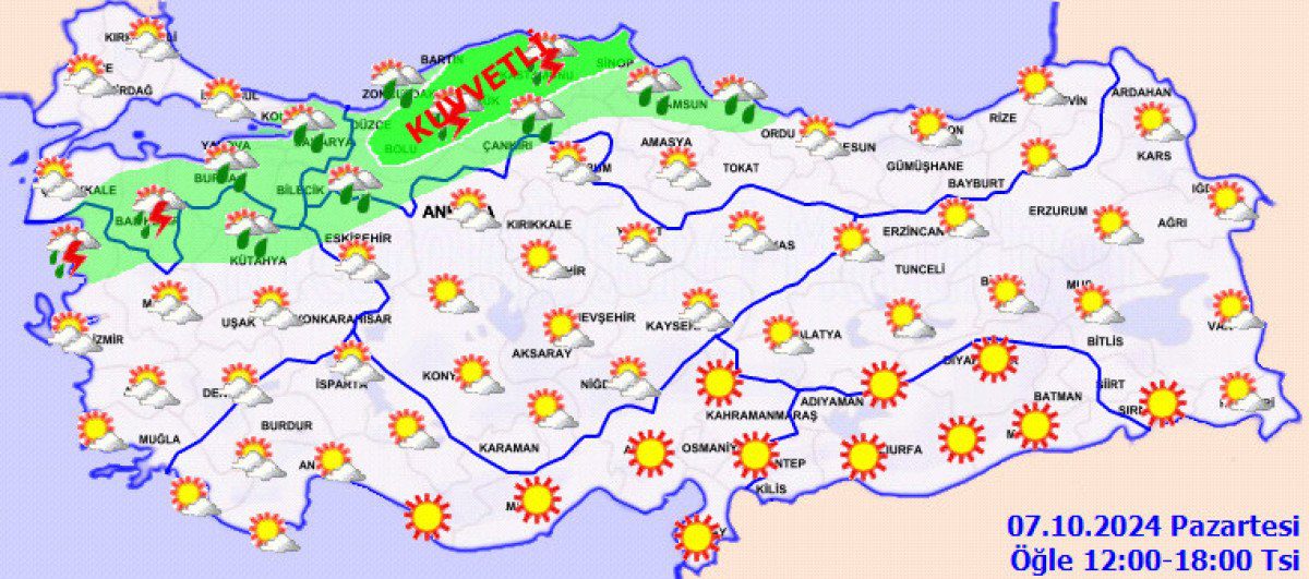 Yağışların yer yer kuvvetli olması bekleniyor. KASTAMONU °C, 23°CParçalı ve çok bulutlu, sabah ve öğlen saatlerinde mahallî olmak üzere sağanak ve gök gürültülü sağanak yağışlı geçeceği kestirim ediliyor. Yağışların yer yer kuvvetli olması bekleniyor. ZONGULDAK °C, 22°CParçalı ve çok bulutlu, sabah ve öğlen saatlerinde lokal olmak üzere sağanak ve gök gürültülü sağanak yağışlı geçeceği iddia ediliyor. Yağışların yer yer kuvvetli olması bekleniyor.