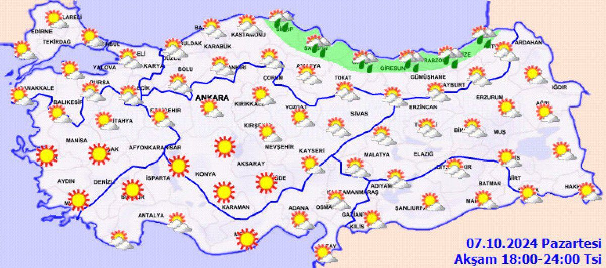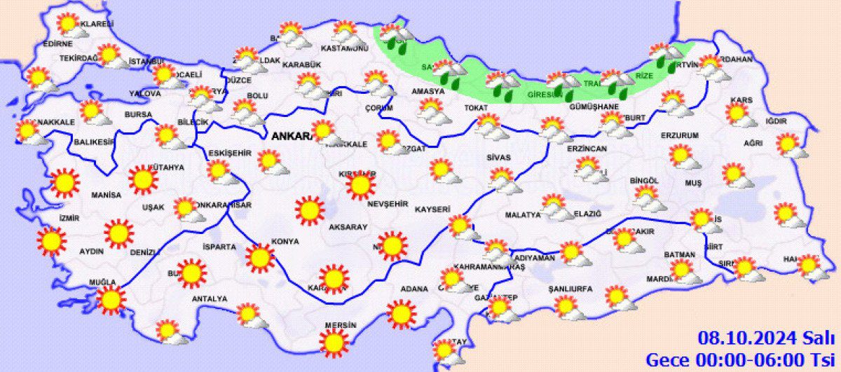 Parçalı ve çok bulutlu, kıyı kısımlarının sağanak ve gök gürültülü sağanak yağışlı geçeceği kestirim ediliyor. AMASYA °C, 31°CParçalı bulutluSAMSUN °C, 27°CParçalı ve çok bulutlu, öğlen saatlerinden itibaren mahallî olmak üzere sağanak ve gök gürültülü sağanak yağışlıTOKAT °C, 30°CParçalı bulutluTRABZON °C, 26°CParçalı ve çok bulutlu, akşam saatlerinden itibaren mahallî olmak üzere sağanak ve gök gürültülü sağanak yağışlı