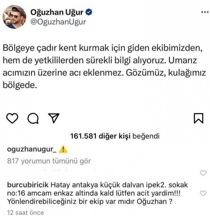 Instagram’da Oğuzhan Uğur’un paylaşımına yorum yapan Biricik, şunları yazdı: