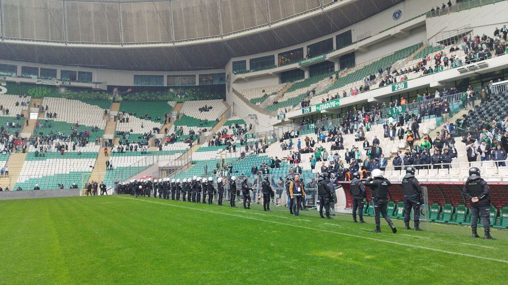 TFF 2’nci Lig Beyaz Grup’un 23’üncü haftasında Bursaspor, Amed Sportif Faaliyetler’i konuk ediyor. Karşılaşmayı yaklaşlık 40 bin Bursaspor taraftarı takip ederken, konuk ekibin taraftarları güvenlik nedeniyle stadyumda yer alamayacak. Saha dışında ve içerisinde geniş güvenlik önlemleri alınırken, maç öncesi iki takımın futbolcuları arasında arbede yaşandı.