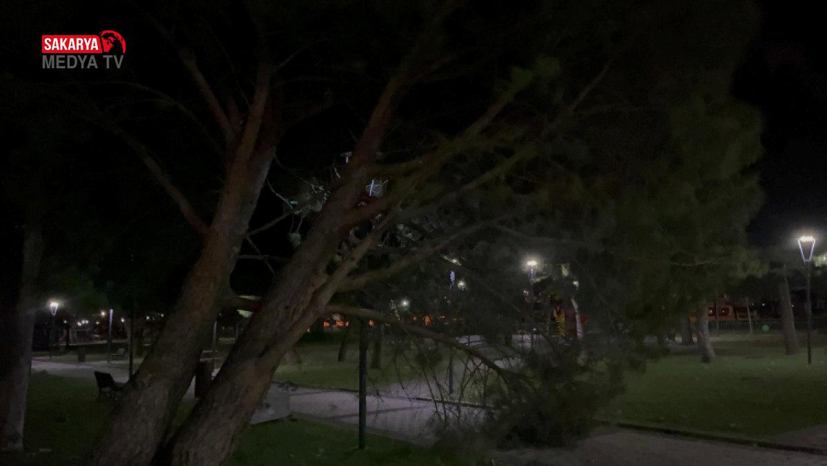 Sıhhat Parkı’nda bulunan birçok ağaç, şiddet lodos nedeniyle yerinden sökülürken, parktaki çöp konteynerleri ise devrildi.