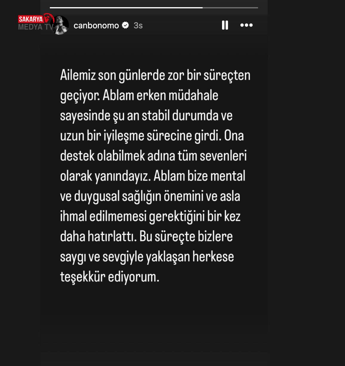Instagram hesabından açıklama yapan Can Bonomo, “Ailemiz son günlerde zor bir süreçten geçiyor. Ablam erken müdahale sayesinde şu an stabil durumda ve uzun bir iyileşme sürecine girdi. Ona destek olabilmek adına tüm sevenleri olarak yanındayız. Ablam bize mental ve duygusal sağlığın önemini ve asla ihmal edilmemesi gerektiğini bir kez daha hatırlattı. Bu süreçte bizlere saygı ve sevgiyle yaklaşan herkese teşekkür ediyorum” dedi. #canbonomo Engelli ve kimsesiz 165 köpeğe çiftliğinin kapılarını açtığı haberleriyle yakın zamanda gündeme gelen Funda Bonomo’nun intihar sebebi henüz öğrenilmedi. (BSHA – Bilim ve Sağlık Haber Ajansı)